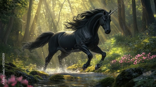 A majestic black unicorn with a long, flowing mane and tail strides gracefully through a sunlit forest