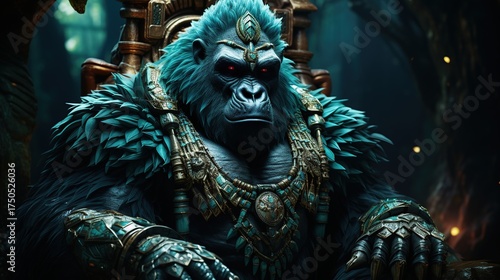 A Majestic Blue-Haired Gorilla King Adorned in Ornate Golden and Jewel-Studded Regal Attire, Seated on an Elaborate Throne
