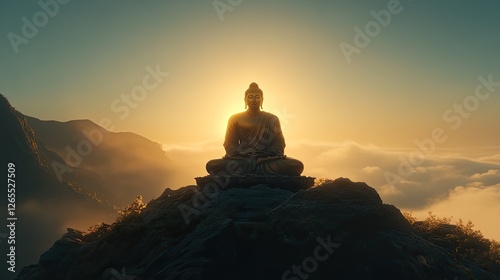 A majestic Buddha seated on a mountaintop, gently illuminated by golden light through fog.