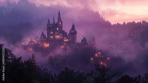 A majestic castle shrouded in mist at dusk, illuminated by soft lights, surrounded by enchanting forests and dramatic landscapes.