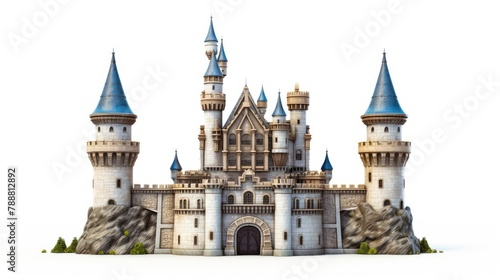 A majestic castle stands tall and proud, its spires reaching towards the sky. The castle is made of gray stone and has blue accents on the roof.