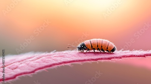 A Majestic Caterpillar Graces the Vibrant Leaf with Intricate Details and Soft Sunset Hues. Natural Macro Shot Texture Environment Concept