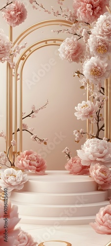 A majestic Chinese New Year podium surrounded by delicate peony flowers and golden accents, with a soft, neutral background perfect for product placement.