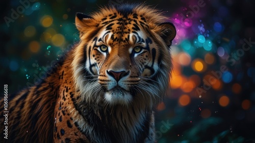 a majestic creature, a hybrid of a lion and a tiger, known as a liger. The creature's powerful build, piercing eyes, and striking coat pattern convey a sense of strength and mystery.