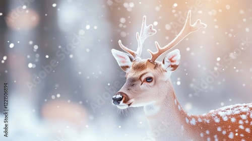 A majestic deer stands gracefully in a snowy forest its antlers adorned with delicate snowflakes. The blurred background creates a tranquil wintry atmosphere highlighting the beauty of nature
