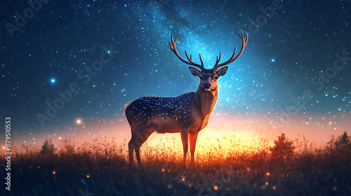 A majestic deer stands in a starry landscape at dusk, evoking a sense of wonder.