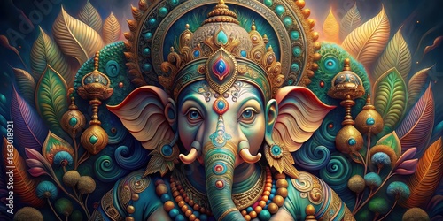 A majestic digital depiction of Ganesha with intricate carvings and ornate details