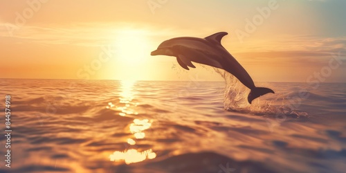 A majestic dolphin leaps out of the water against the backdrop of a golden sunset, symbolizing joy, freedom, and the natural beauty of marine life during dusk.
