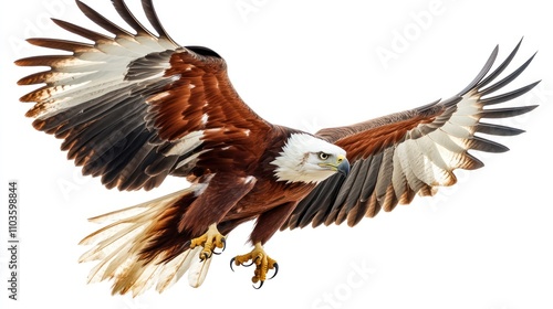 A majestic eagle in flight, showcasing its powerful wings and sharp features.
