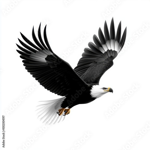 A majestic eagle soaring gracefully through the sky, showcasing its striking black and white plumage and powerful wings.