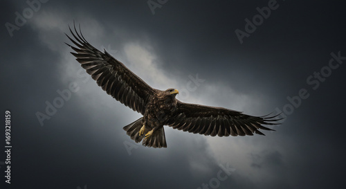 A majestic eagle soars through a dramatic, cloudy sky with its wings spread wide, showcasing its power and freedom