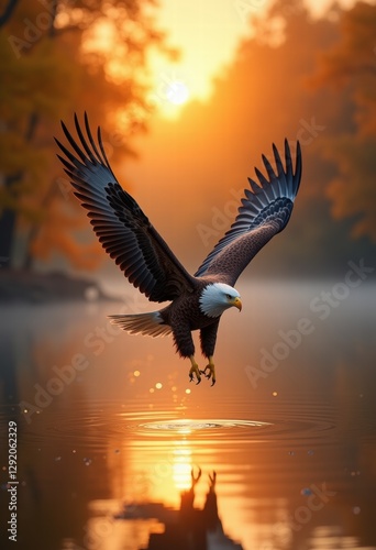 A majestic eagle swoops down over a tranquil lake at sunrise, capturing the beauty of nature in a moment of striking elegance and powerful grace.