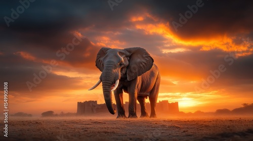 A majestic elephant stands boldly in the savannah at sunset, symbolizing strength and beauty in nature, framed by a dramatic sky that enhances the powerful scene.