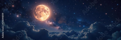 A majestic full moon dominates a vast, star-studded universe, its ethereal glow illuminating cosmic dust and distant galaxies Perfect for fantasy, sci-fi, or mystical themes , galaxy, full moon
