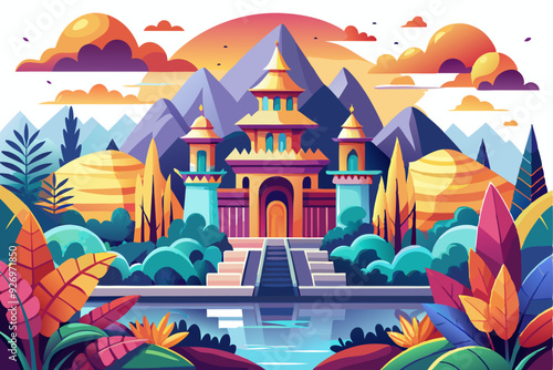 A Majestic Golden Palace Surrounded by Lush Foliage and Mountains