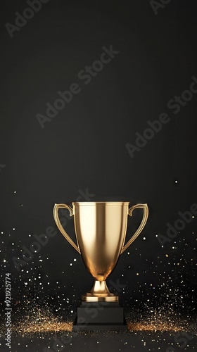 A majestic golden trophy surrounded by shimmering particles on a black background symbolizing victory and achievement