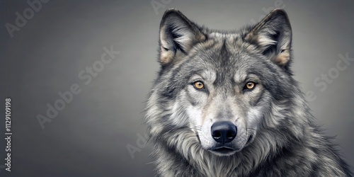 A Majestic Gray Wolf With Striking Yellow Eyes Gazes Intently at the Camera, Its Fur Softly Reflecting the Light, Creating a Captivating Portrait of Wild Beauty