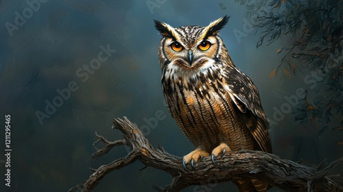 A majestic great horned owl perched regally on a gnarled dark branch under the inky night sky