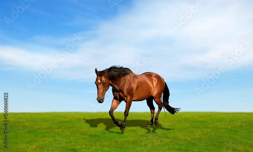 A majestic horse in motion across a grassy environment Brown horse grazing on grass in a field near a forest, outdoors in summer