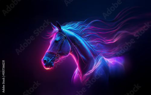 A majestic horse with flowing mane and tail that is rendered in a vibrant blue and pink color. The horse's head is turned to the side, showcasing its powerful features.