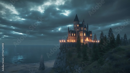 A majestic illuminated castle perched precariously on a cliff overlooking a dark turbulent sea under a dramatic stormy sky