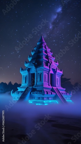 A majestic, illuminated temple structure bathed in vibrant blue and purple hues, set against a starry night sky.