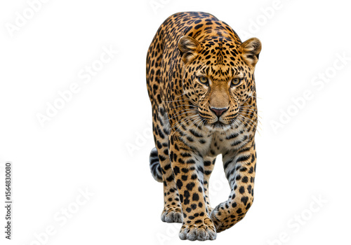 A majestic leopard walking forward with a focused gaze, isolated on transparent background