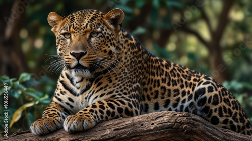 A majestic leopard with a powerful gaze rests on a tree branch, its spots blending seamlessly with the surrounding foliage.