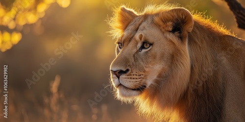 A majestic lion gazes into the distance against a golden backdrop, symbolizing strength, courage, and natural beauty.