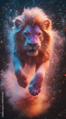 A majestic lion leaps through vibrant clouds of holi powder, soaring gracefully in dramatic light amidst a cosmic backdrop