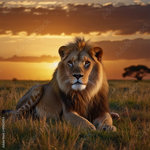 A majestic lion lounging on a grassy savanna at sunset, surrounded by the golden hues of the setting sun and the vast expanse of the African plains
