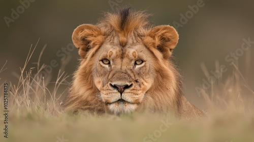 A majestic lion rests in tall grass, showcasing its powerful presence and striking features in a natural setting.