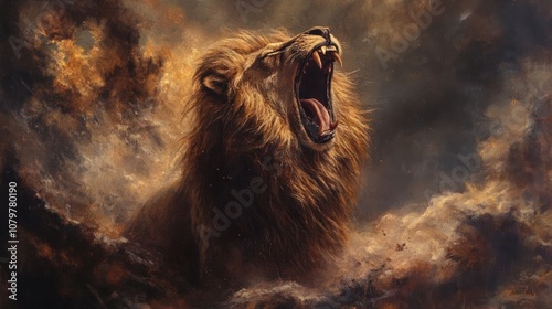 A majestic lion roaring amidst a dramatic, stormy backdrop, symbolizing strength and power.