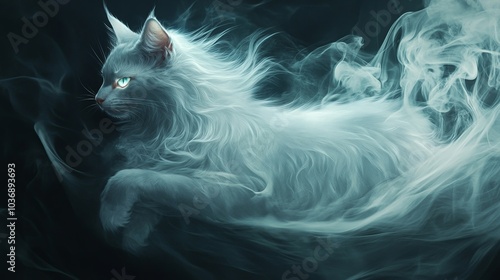 A majestic long-haired white cat with glowing eyes, floating amidst magical white smoke effects.