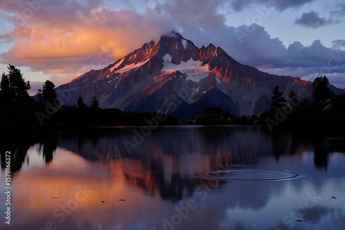 A majestic mountain reflects in a still lake at sunset