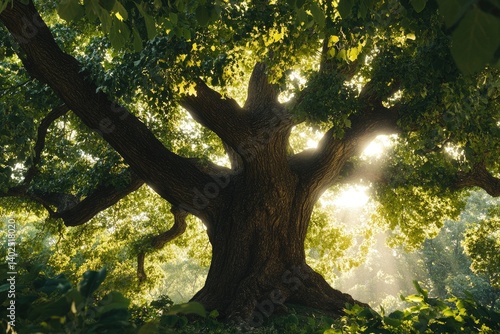 A majestic oak tree with roots deep into the earth, surrounded by lush green leaves and sunlight filtering through its branches.
