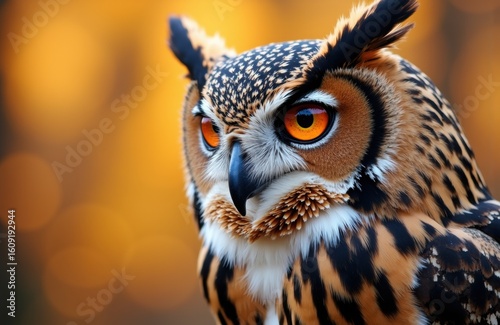 A majestic owl with striking orange eyes and detailed feather patterns gazes intently into the distance