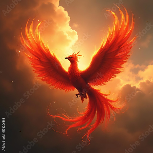 A Majestic Phoenix Rising from Fiery Clouds at Dusk, Symbolizing Rebirth and Transformation