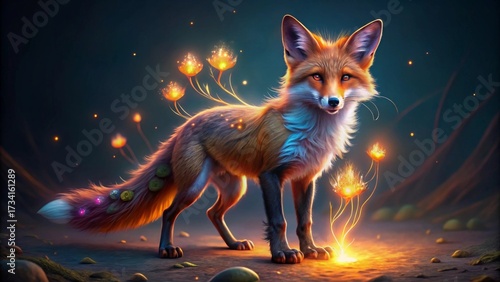 A Majestic Red Fox with Luminescent Flora Adorning Its Tail and Flanks, Standing Proudly in a Mystical Nighttime Setting