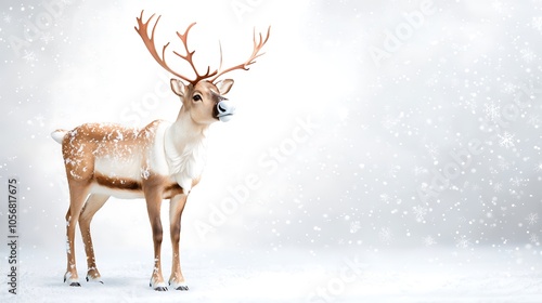 A majestic reindeer standing gracefully in a snowy landscape, showcasing its majestic antlers against a backdrop of gently falling snowflakes. The lighting highlights the reindeer's intricate fur