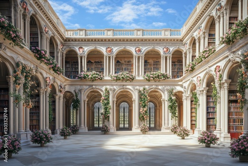 A majestic Renaissance-style library with floral friezes, arched entrances, and a symmetrical courtyard