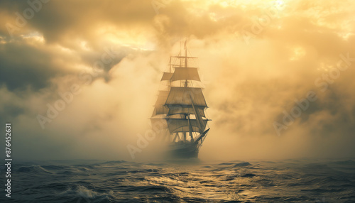 A majestic sailing ship navigating through misty waters under a golden sky creating a sense of adventure and mystery