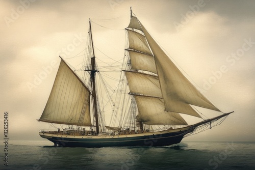 A majestic schooner sails gracefully on a misty sea, its sails billowing in the gentle breeze.
