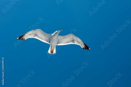 A majestic seagull flying in a clear blu sky in summer season at Thasos Island in Greece