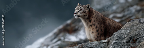 A majestic snow leopard sits gracefully on a rocky ledge, alert and vigilant, embodying the beauty and power of wildlife in its natural mountainous habitat.