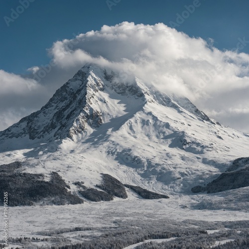 A majestic snow-covered mountain standing alone in the distance, framed by soft, drifting clouds and an almost pure white background.