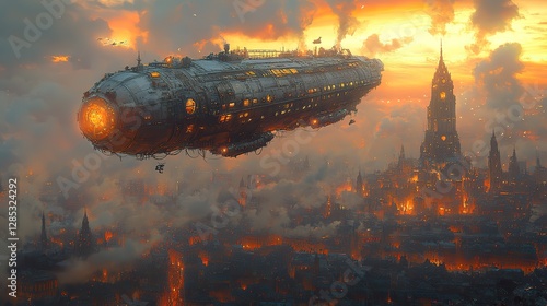 A majestic steampunk airship glides over a vibrant cityscape, evoking a sense of wonder and adventure
