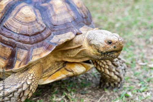 A majestic Sulcata tortoise crawls leisurely across a vibrant green lawn, its textured shell showcasing intricate patterns that highlight its natural beauty