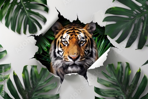 A majestic tiger emerges through a torn white backdrop, surrounded by vibrant green tropical leaves