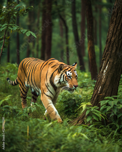 A majestic tiger prowling through a dense jungle, showcasing the beauty and strength of this magnificent predator.